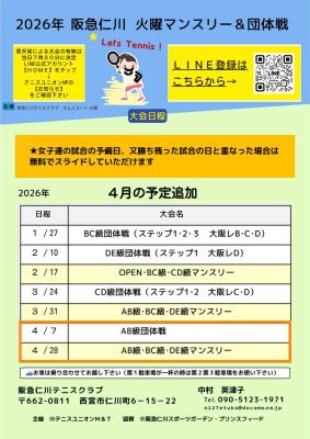 阪急仁川火曜マンスリー&団体戦の2026年4月の予定決定!! 2026.01.18 お知らせ コーチブログ 担当コーチ 佐々木 大介 いつも阪急仁川の🎾マンスリー&🎾団体戦にご参加いただき、ありがとうございます。 本年もどうぞよろしくお願いいたします。 4月の予定が決まりましたので、お知らせいたします📢 1月~3月もまだまだ空きがあります。 是非ご検討のうえ、ご参加いただけましたら嬉しいです😊 尚、クラブハウスは3月よりご利用可能の予定ですので、それまでご協力の程、宜しくお願い致します。 ツイートする < 🎍2026年・新年のご挨拶🎍 一覧 最近の記事 阪急仁川火曜マンスリー&団体戦の2026年4月の予定決定!! 2026.01.18 お知らせ コーチブログ 🎍2026年・新年のご挨拶🎍 2026.01.01 コーチブログ ☆2025年阪急仁川テニススクール生徒さんの戦績☆ 2025.12.30 コーチブログ TRY!PICKLEBALL!! 2025.12.24 コーチブログ ~NO TENNIS NO LIFE~ 2025.12.17 コーチブログ アーカイブ 2026年1月 (2) 2025年12月 (5) 2025年11月 (5) 2025年10月 (6) 2025年9月 (4) 2025年8月 (9) 2025年7月 (4) 2025年6月 (8) 2025年5月 (4) 2025年4月 (7) カテゴリー お知らせ キャンペーン グッズ紹介 コーチブログ コーチ紹介 本山インドアテニススクール 阪急仁川テニススクール